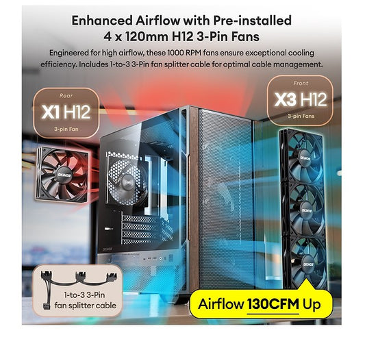 OKINOS AQ93 3-Sided Pannoramic ViewTempered Glass ,ATX USB-C, Pre-Installed 2×120mm ARGB PWM Fan, Mid Tower Case