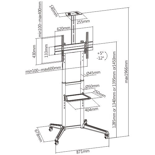 Brateck Versatile Compact Steel TV Cart with top and center shelf for 37'-70' TVs Up to 50kg, Fine Texture Black, 871x678x1966mm (LS)