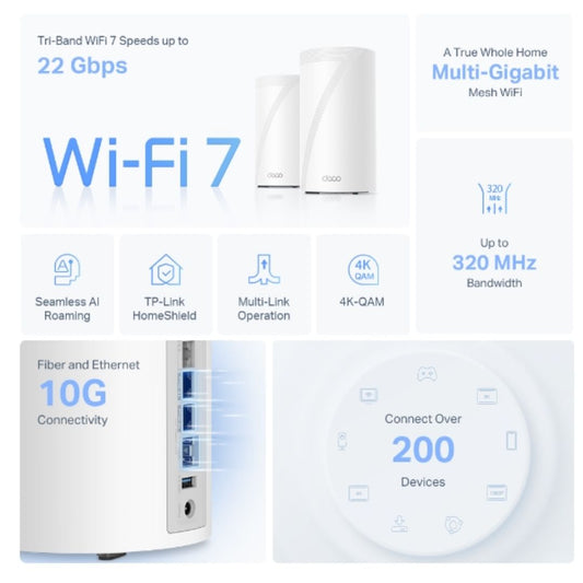 TP-Link Deco BE85(3-pack) BE22000 Tri-Band Whole Home Mesh Wi-Fi 7 System (WIFI7) 1376 Mbps at 2.4 GHz + 8640 Mbps at 5 GHz + 11520 Mbps at 6 GHz