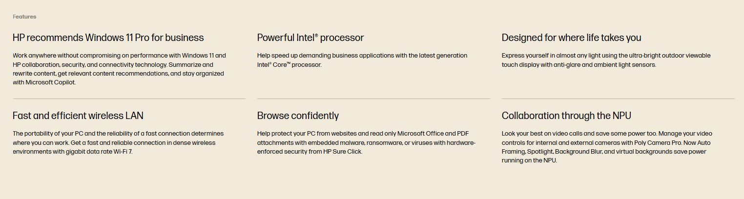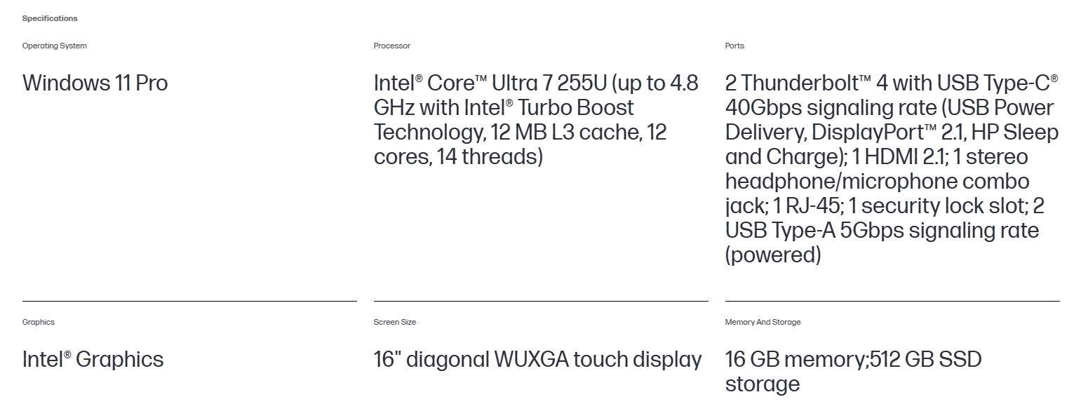Ports 1 HDMI 2.1; 1 stereo headphone/microphone combo jack; 1 RJ-45; 1 security lock slot; 2 USB Type-A 5Gbps signaling rate (powered); 2 Thunderbolt™ 4 with USB Type-C® 40Gbps signaling rate (USB Power Delivery 3.0, DisplayPort™ 2.1, HP Sleep and Charge);Cables are not included.